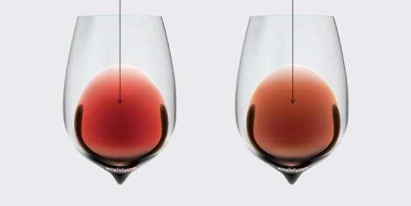 如上圖可以看出:一般陳釀的紅葡萄酒顏色會加深,通常邊緣色調較寬,其單寧跟色素會發生聚合反應,色彩逐漸衰退,逐漸向磚紅色和棕色發展,不會帶有紫色的邊緣色調。陳釀數十年的葡萄酒通常會有琥珀色或茶色。酒腿是指搖晃酒杯之后,在杯壁上形成的一層酒液膜和緩緩流下的一串串液體。這些像眼淚一樣掛在杯壁上的液體也被稱為“酒淚”或是“掛杯”。它的形成與酒精接觸空氣揮發有關,也與葡萄酒的殘糖含量有一定關系。一般來說,如果一杯葡萄酒越粘稠,酒腿越厚,流動的速度越慢,則大致可以推斷該酒的酒精度高或者甜度高。邊緣密度高,比較高的可能性是酒體扎實、釀得不錯的酒;如果這個邊緣看上去顏色稀疏,有可能那一年的葡萄在成熟期時雨水比較多,要不然,就是破皮率比較高。