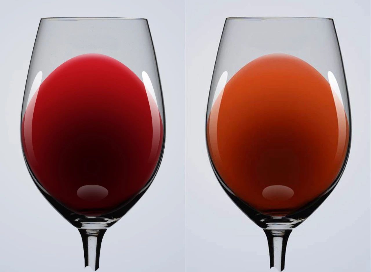 如果葡萄酒中的懸浮粒子在可以接受的水平范圍,那么這款葡萄酒就是“澄清的”,相反則會被描述為“朦朧的”或“渾濁的”。如果酒中存在過多的懸浮粒子,那這款葡萄酒的品質很可能已經受到了影響,比如受到微生物的污染。此外,如果這款酒過于朦朧,可能表示這款酒已出現了“缺陷”,具體屬于哪種問題還需要在聞香后進行確定。在最外圍的水色邊緣,仿如一層油浮在酒液的最上面,如果無法從正上方而45°角觀察,可從酒杯的底面反視,即可發現一層透明如水的液體浮在最上層,這一層水色邊緣的寬度會隨著年份而加寬,同時會越來越清澈。繼續觀察實體顏色的邊緣,這個邊緣也會隨著年份產生變化。年輕的紅酒,這個邊緣會帶有紫羅蘭的色澤,愈淺齡,紫色愈深,若經過約4~5年的瓶內陳熟后,這個邊緣會逐漸褪色,和中間色帶的顏色一致,若經過更長的貯藏時間,其顏色會轉變成磚紅色或橘紅色,最后色澤轉成琥珀色。因此,這兩個邊緣是觀察葡萄酒年分重要的指標。